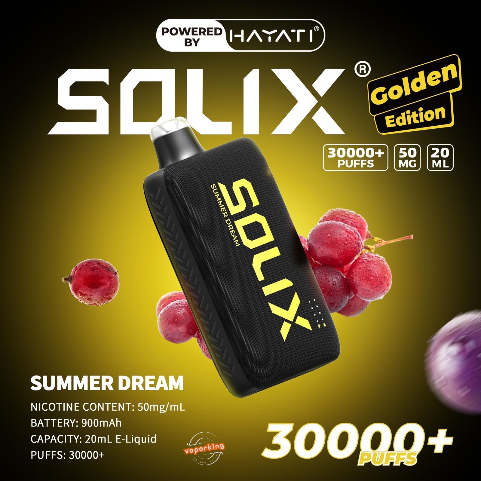 Hayati Solix 30000 Puffs Disposable Golden Edition Vape Kit is a premium device delivering 30,000+ puffs, powered by a 900mAh rechargeable battery with Type-C fast charging. With 50mg nicotine strength, double mesh coil, and smart modes, it offers smooth flavour, rich clouds, and a stylish design in exciting flavours.