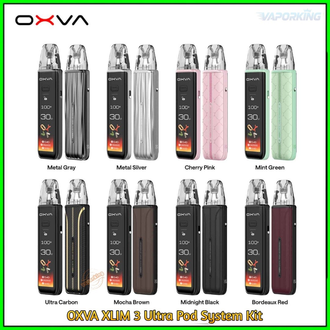 The OXVA Xlim 3 Ultra pod system is available in 8 colours: Midnight Black, Metal Silver, Ultra Carbon, Metal Grey, Bordeaux Red, Mint Green, Cherry Pink, and Mocha Brown.